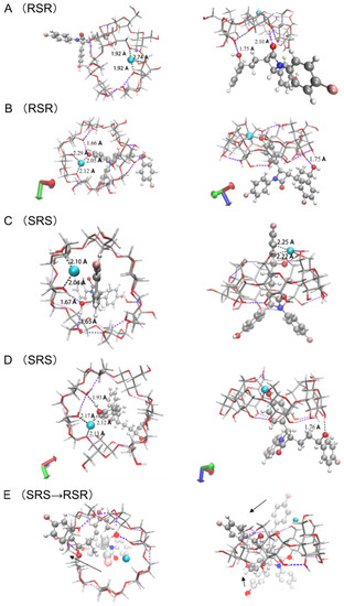As it is described previously, both the RSR-EZM and SRS-EZM are observed to be stabilized with one OH group coordinating with the Cu and the other forming H-bond with the oxygen on the β-CD (Figure 6B,D). However, the SRS-EZM tend to pass through the β-CD cavity and stretch to other side (Figure 6C) while the RSR-EZM is more likely to drop down from the cavity (Figure 6A). This may result from the difference of their conformation. Taking Figure 6C as an example, assuming that the SRS-EZM are replaced with RSR-EZM, the hydroxyphenyl and the 3-(4-fluorophenyl) in the drug molecule would both tilt to the β-CD and even insert into its skeleton (Figure 6E). Compared with the SRS-EZM, the RSR-EZM cannot form coordinate bonds with the copper ion. Besides, the angle between the two 4-fluorophenyls enlarges to almost 180°, causing the steric geometry conformation of the drug molecule to become greatly distorted. During our optimization, when the RSR-EZM is put completely penetrating the whole β-CD cavity manually for the initial structure, the optimized procedure always turns out to be a failure, which is corresponding to the assumption.