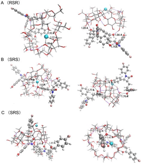 Interestingly, SRS-EZM can stabilize in two forms (Figure 7B,C). The optimized structures illustrate that one of the drug molecules would coordinate with the Cu(II) ion and the other would connect the β-CD with the H-bond. In Figure 7B, the Cu(II) ion form a coordinate covalent bond with one oxygen atom on the SRS-EZM with a bond length of 2.03 Å. The remaining coordinate bonds involved the oxygens on the β-CD with a longer bond length of 2.15 and 2.16 Å. Except that, the two SRS-EZMs both interacted with the β-CD through four H-bonds. The SRS-EZM not only coordinated with copper ion, but also formed two H-bonds with the length of 1.74 Å and 1.76 Å, respectively. The other drug molecule binds at the other side with 1.76 Å and 1.77 Å H-bonds. The two drugs have no interactions between each other. In general, the SRS-EZM ternary complex owns a lower binding energy than RSR-EZM (~14.46 kcal/mol lower), indicating that the former is more stable, which is consistent with the result of the MS spectra.