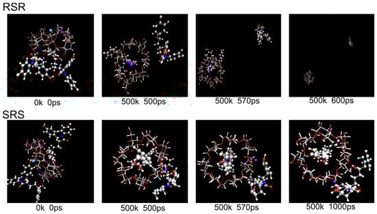 The MD simulation was also performed to investigate the relative binding strength of the two EZM with the [CuII(β-CD)]2+ complex. The most stable structures of [CuII(β-CD)(EZM)2]2+ derived from the DFT results were taken as the initial model. The snapshots taken at different simulation time from the trajectory are shown in Figure 8. For both RSR and SRS complex, the drug molecules can stay close to the β-CD when the temperature gradually increased up to 500 K within 500 ps, indicating a reasonable initial structure suggested by the DFT calculation. Afterwards, the RSR complex started to break up at 570 ps and one of the drug molecules moved away from the β-CD, while the other still stayed inside. In contrast, the SRS complex shows obvious stability within the 1000 ps run, which is consistent with the previous results, revealing that the [CuII(β-CD)(SRS-EZM)2]2+ is more stable than [CuII(β-CD)(RSR-EZM)2]2+.