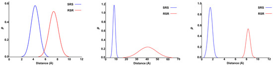MD simulations can provide auxiliary information for clarifying the enantiomers separation mechanism. As is shown in Figure 8, the Cu(II) ion in RSR complex stayed at the center of the small rim, while in SRS complex, the copper ion coordinated with the oxygen atom on the outside drug molecule all the time. Different configurations lead to different binding mode, which are related to their different stability. Compared with SRS-EZM, RSR-EZM cannot penetrate the cavity to coordinate with Cu(II) ion. H-bond is the only connection between RSR-EZM and β-CD. Thus, [CuII(β-CD)(RSR-EZM)2]2+ squint towards to lose one RSR-EZM molecule. To further prove such a difference between the two enantiomers, three parallel simulations were performed for each drug molecule by placing them at different initial places. The distances between the EZM and [CuII(β-CD)]2+ are calculated from these MD trajectories, and the normalized distributions of the distances calculated from the three runs are shown in Figure 9. It is obvious that compared with RSR-EZM, SRS-EZM always keeps closer around the β-CD, starting from various initial structures. It further proves the better stability of the RSR-complex.