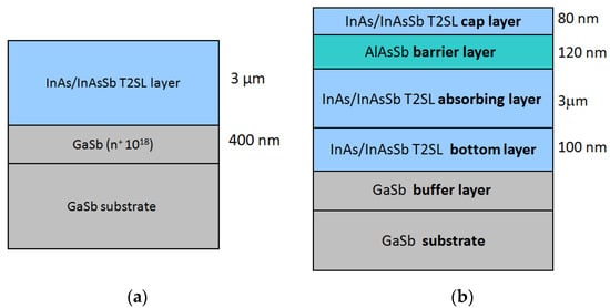 - Durlin, Q.; Perez, J.P.; Rossignol, R.; Rodriguez, J.B.; Cerutti, L.; Delacourt, B.; Rothman, J.; Cervera, C.; Christol, P. InAs/InAsSb superlattice structure tailored for detection of the full midwave infrared spectral domain. In Proceedings of the SPIE Quantum Sensing and Nano Electronics and Photonics XIV, San Francisco, CA, USA, 29 January–2 February 2017; Volume 10111, p. 1011112. [Google Scholar]