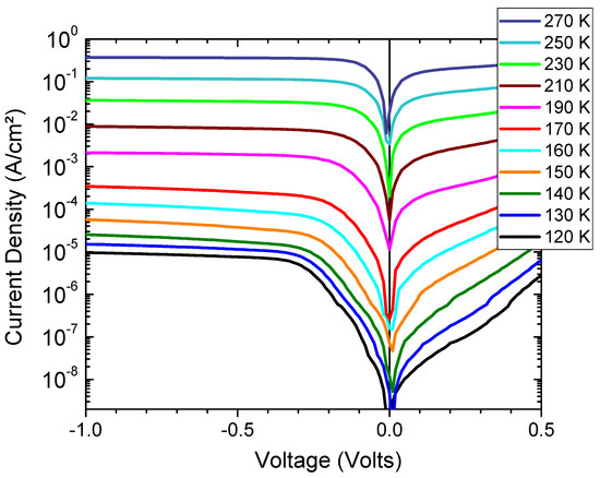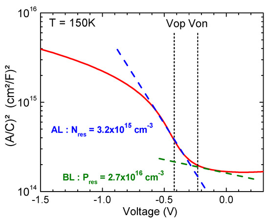 3.3. Dark Current–Voltage and Capacitance–Voltage Measurements