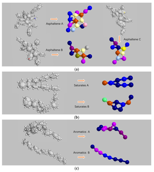 The mapping scheme of the bitumen molecule model. (a) Mapping scheme of asphaltenes. (b) Mapping scheme of saturates. (c) Mapping scheme of aromatics. (d) Mapping scheme of polar aromatics.