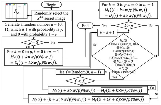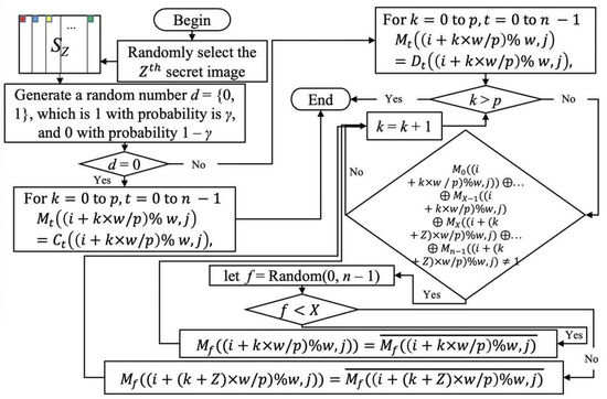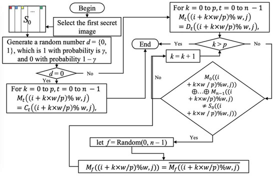 | Input: N secret images with size pixels, a positive integer p (must be a divisor of w, and coprime to N – 1). Output: Two shares and with size .