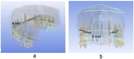 - Hedayati, Z.; Shomali, M. Maxillary anterior en masse retraction using different antero-posterior position of mini screw: A 3D finite element study. Prog. Orthod. 2016, 17, 31. [Google Scholar] [CrossRef]