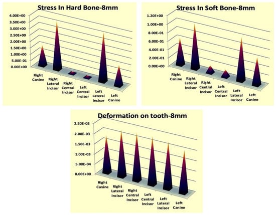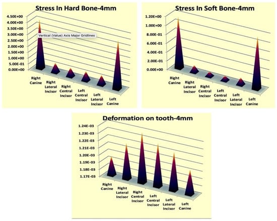 Two finite element models were generated with 4 mm and 8 mm power arm height as group 1 and group 2, respectively. Stresses generated in and around the maxillary anterior segment in group 1 were shown in Table 3, Figure 4 and Figure 5. The most stressed hard and soft bones were found around the right canines (1.168 MPa, 4.1508 MPa) and left canines (1.168 MPa, 4.055 MPa). Moreover, the most deformation was observed in the right lateral incisor (1.2499 × 10−3) followed by the right central incisors (1.2396 × 10−3). The stress values were found not to be significantly different (p > 0.05) when compared to the left side and the right side.