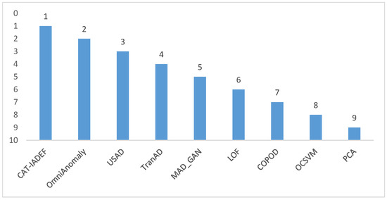 Table 2 that CAT-IADEF achieved the best F1 values on the data subsets T4 of MSL, Valve1-4 and Valve1-14 of SKAB, and D15 of MSL; these values were, respectively, 0.747, 0.929, 0.987, and 0.993. On the P1 subset of SMAP, OmniAnomaly’s method achieved the best F1 value of 0.924, and CAT-IADEF’s F1 value of 0.923 ranked second. On the data subset of SWaT, the TranAD method achieved the best F1 value of 0.814, and CAT-IADEF’s F1 value of 0.811 ranked fourth. On the data subset T1 of SMAP, the LOF method performed the best, with an F1 value of 0.971, and the F1 value of CAT-IADEF was 0.960, ranking second. We rank the F1 of the models comprehensively on all datasets, as shown in