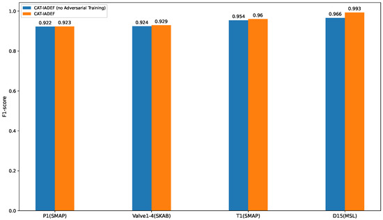 Figure 3 shows the F1 scores of the CAT-IADEF and CAT-IADEF (no adversarial training) models on four experimental datasets.