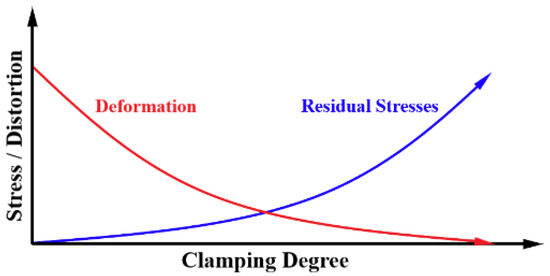 Relationship between clamping degree and the level of distortion as well as the effect on residual stresses [22].