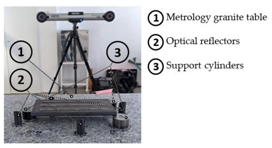 For the analysis of distortions with digital mode, the metrological equipment for acquiring geometric points from Creaform was used, which is composed of C-Track 780, HandyPROBE, and MetraSCAN 3D. In Figure 4, it is possible to observe the experimental set-up for measuring the specimens’ distortions.