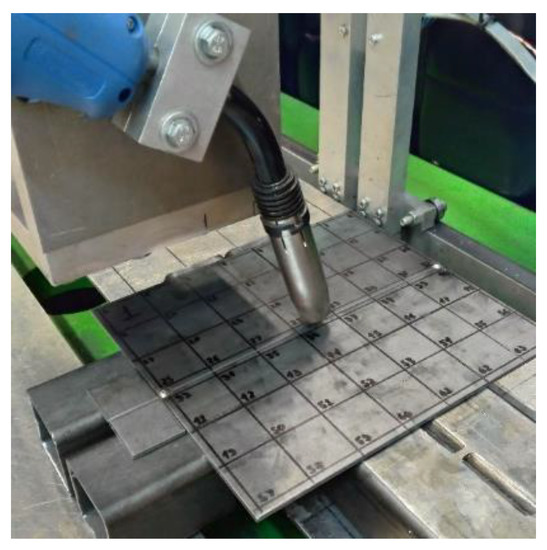 To carry out the experiment, 12 pairs of S235JR steel sheets with dimensions of 220 × 100 × 3 mm were obtained, and a 30 × 30 mm control grid was created (Figure 5) with 64 nodes (measurement points) for the analysis of distortions.
