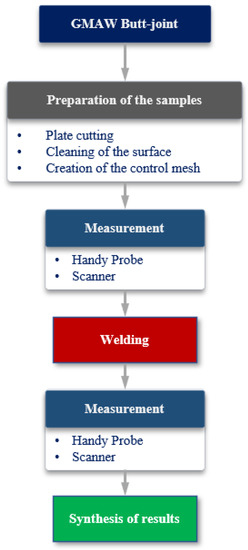 The order of the methodology used is represented in the flowchart of Figure 9. To prepare GMAW butt joints previously, it was necessary to cut carbon steel sheets in agreement with the defined dimensions, followed by a cleaning process using a cloth and solvent (acetone), and then creating a control mesh, drawing orthogonal lines at same distances. Before performing the welding of sheets, a control measurement which is used as reference values was implemented; these measurements were taken using the C-Track 780, HandyPROBE, and MetraSCAN 3D system. The welding process was carried out according to the sequence presented in Figure 7 and using the welding parameters defined in Table 5. The welded sheets were measured with the same equipment used to measure references values. So, a methodology using computerized equipment was performed to measure distortions, making it possible to obtain the coordinates in the operational space with metrological precision.