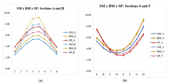 Figure 11a,b indicates the sections with the most expressive distortions (sections A and H and Sections 4 and 5, respectively). Through the comparative graphs of SM × BM × SP, it was possible to analyze the deformation patterns and the amplitudes of the displacements led by welding by comparing the sections. The maximum mean vertical displacement was observed in Section 5 for all welding sequences studied in this work.