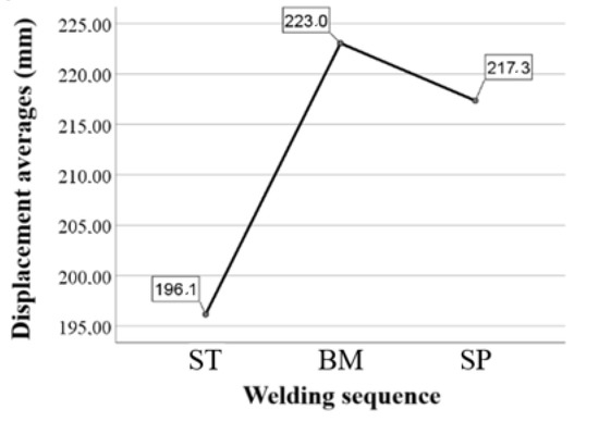 According to what is indicated in Table 9, the p-value obtained with the ANOVA was 0.011, showing the null hypothesis as a result (p < 0.05). Therefore, it is concluded that there is a significant difference in the final distortion of the samples between the welding sequences.