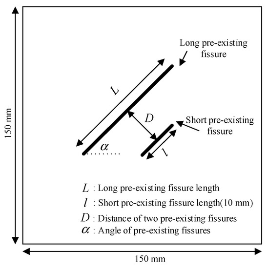 As illustrated in Figure 1, for specimens containing two open unequal parallel straight prefabricated fissures, the short prefabricated fissure length was 10 mm. The other parameters are listed in Table 1.