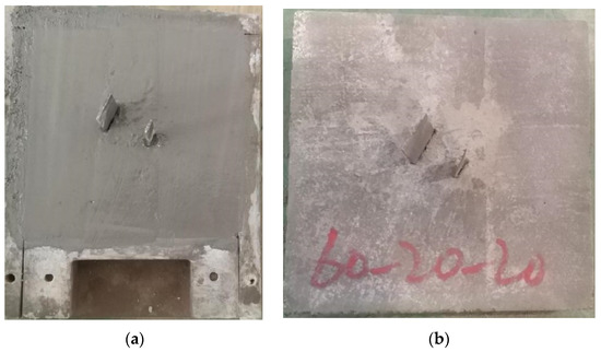 To obtain reliable experimental results, the rock-like material preparation procedures were carefully regulated. An electronic balance weighed the materials to a precision of 0.01 kg. The mixture (the mass ratio of cement, sand, and water was 26:25:10.) was poured into a mold. By placing metal shims into fresh rock-like materials at the intended location, preexisting fissures were made (Figure 2a). When the rock-like materials hardened, the mold was dismantled (Figure 2b), and the shims were gradually removed, leaving the specimen interiors with straight openings.