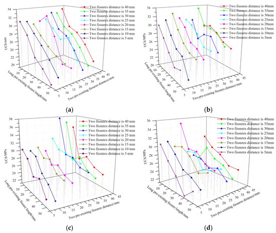 The influence of fissure distance (Figure 6) on the UCS value of rock-like materials is the same as that of the preexisting fissure angle. It can be difficult to find a clear trend with an increase in the distance between two preexisting fissures. Nonetheless, the impact of long preexisting fissure is so great that the impact of the two previous fissures can be ignored.