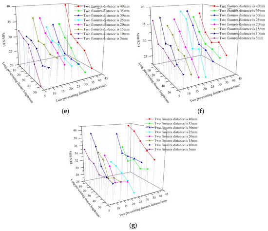 UCS of rock-like materials with a variation in preexisting fissure length. (a) Fissure angles of 0° (b) 15°; (c) 30°; (d) 45°; (e) 60°; (f) 75°; and (g) 90°.