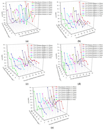 UCS of rock-like materials with variations in the preexisting fissure angle. (a) Preexisting fissure length is 10 mm; (b) 20 mm; (c) 30 mm; (d) 40 mm; and (e) 50 mm.