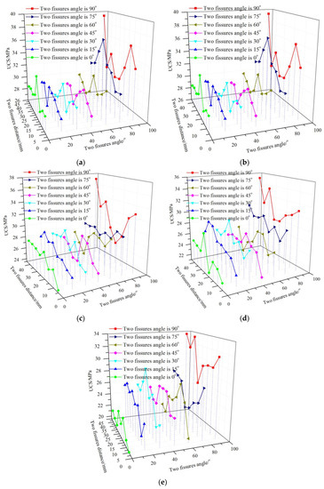 UCS of rock-like materials with variations in fissure distance. (a) 10 mm; (b) 20 mm; (c) 30 mm; (d) 40 mm; and (e) 50 mm.