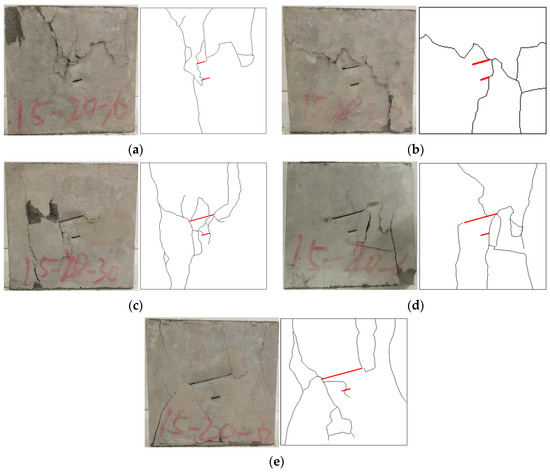 A greater preexisting fissure length more significantly affected the crack propagation and coalescence of rock-like materials. The experimental results of rock-like materials with a fissure angle of 15° and a distance of 20 mm are taken as examples. As illustrated in Figure 7, long preexisting fissures played a key role in the propagation and coalescence of rock-like materials. With increasing the preexisting fissure length, an increasing number of newly generated cracks were connected with the preexisting fissure, especially for failure specimen 15-20-50. Most newly generated cracks were connected with long preexisting fissures, while only one newly generated crack propagated across a short preexisting fissure. In contrast, when the long preexisting fissure was not long enough, more newly generated cracks appeared around the short preexisting fissure, as demonstrated by failure specimen 15-20-30. Therefore, the length of preexisting fissure greatly affects the propagation and coalescence of rock-like materials containing two unequal parallel preexisting fissures.