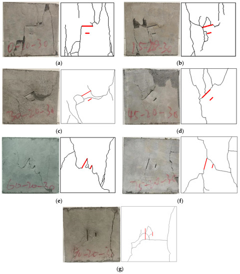 Influence of the preexisting fissure angle on crack propagation and coalescence. (a) Failure specimen 0-20-30; (b) 15-20-30; (c) 30-20-30; (d) 45-20-30; (e) 60-20-30; (f) 75-20-30; and (g) 90-20-30.