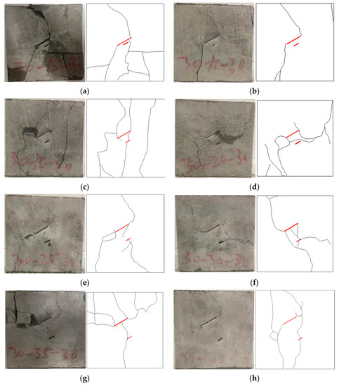 Influence of fissure distance on crack propagation and coalescence. (a) Failure specimen 30-5-30; (b) 30-10-30; (c) 30-15-30; (d) 30-20-30; (e) 30-25-30; (f) 30-30-30; (g) 30-35-30; and (h) 30-40-30.