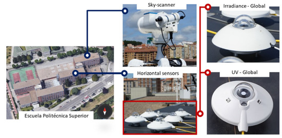 All meteorological and radiometric experimental data used in this study were recorded at the weather station of the SWIFT Research Group, located on the roof of the Higher Polytechnic School building (EPS) of Burgos University (42°21′04″ N, 3°41′20″ W, 856 m above mean sea level). Figure 1 shows the location of the meteorological station on the flat roof of the EPS building, which is where the climatic parameters were measured. These parameters were as follows: ambient temperature, relative humidity, atmospheric pressure, wind speed and direction, and rainfall. A Kipp & Zonen CUV5 sensor was used to measure GHUV. GHI data were measured with a (Hulseflux, model SR11) pyranometer. Sky luminance and radiance distributions were determined with a commercial MS-321LR sky scanner manufactured by EKO Instruments (EKO Instruments Europe B.V. Den Haag, The Netherlands). The technical specifications of the various measurement instruments are shown in Table 2, Table 3 and Table 4. A complete description of the experimental facility and its location can be found in previous papers [62,63].