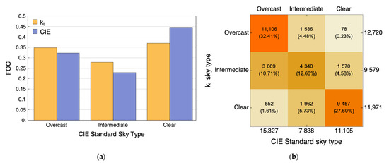 (a) Frequency of occurrence (FOC) of the CIE and sky classifications in Burgos (Spain) from 14 September 2020 to 6 June 2022; and (b) confusion matrix showing the coincidences in the classifications obtained according to both criteria.