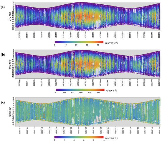 Figure 4 shows the evolution of the 10 min values of GHUV, GHI, and its ratio (GHUV/GHI), which were measured in Burgos throughout the experimental campaign. It should be noted that the gray areas that appear in the three plots in Figure 4, for each day between sunrise and sunset, correspond to missing data, either because they were not recorded or because they did not pass the QC described in Section 2. With regard to Figure 4c, the GHUV/GHI ratios assume values between 1% and 10%; however, the highest values are clearly concentrated in the early hours of the day, and they decrease significantly during the central hours, although there is no clear trend throughout the day. This evolution is analyzed in detail in Section 3.3.