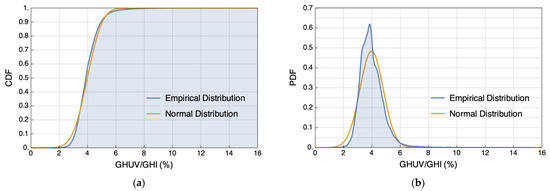 Although the scale used to represent the GHUV/GHI ratio values in Figure 4c reaches up to 10%, there are some values that considerably exceed this threshold (up to 15.21%): however, as can be seen in Figure 5a, which shows the Cumulative Distribution Function (CDF) of the 10 min GHUV/GHI ratios, the probability of this ratio exceeding 10% is extremely low (less than 0.05%). Figure 5a also shows the good fit between the empirical CDF (blue line) and the CDF adjusted to a normal distribution function (yellow line). This can also be seen in Figure 5b, which shows the empirical Probability Distribution Function (PDF) of the 10 min GHUV/GHI ratios, and the adjusted PDF that shows a normal distribution.