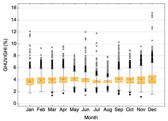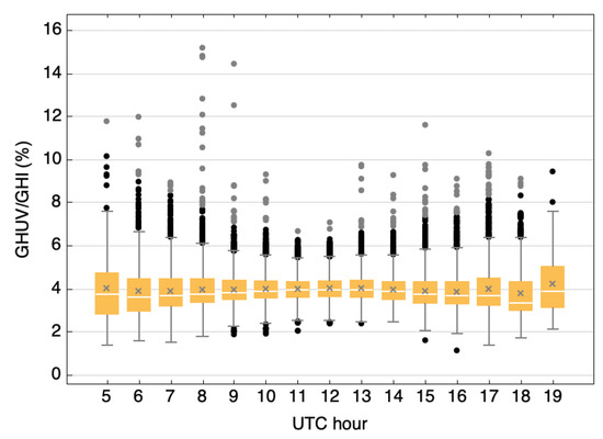 Figure 6 shows the boxplot of the mean hourly values of the GHUV/GHI ratio, calculated from the average of the 10 min data, from sunrise to sunset, using the whole database. The graph represents the mean value (gray crosses), the median (white lines), the three quartiles, and both the maximum and minimum data values, as well as the outlier values. The mean hourly value of GHUV/GHI remained almost constant throughout the day. As previously noted, a small increase can be seen in the early hours of the day, which tends to stabilize during the central hours, and increases again at sunset. As the interquartile range shows, a greater dispersion of values in the first and last hours (1.9% at 5:00 h and 19:00 h), than in the central hours (0.75% at 12:00 h), of the day is observable. The average values were higher than the median values across all hours of the day. The hourly average of the ratio was , with maximum and minimum values of and %, at 19:00 and at 18:00 h, respectively. These data, shown in Table 1, are comparable with other data from different locations in Spain. The hourly GHUV/GHI ratio in Burgos is higher than the ratio recorded at Almería (3.7%) [53], and lower than the ratios recorded at Granada (4%) [53], Valladolid (4.1%) [22], Valencia (4.2%), and Cordoba (4.9%) [23]; this is mainly due to each location’s different sky conditions and their various heights above sea level.