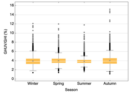 Figure 7 and Figure 8 show the statistical analysis of the monthly and seasonal averages of the GHUV/GHI ratio, which was calculated using the averages of the 10 min dataset, using the whole database. Figure 7 shows that the monthly data were almost constant throughout the year, with a small decrease in July and August. The standard deviation fluctuated between 0.69 and 1.23%, and the interquartile range was between 0.44% and 1.56%. December and January were the measurement campaign months with the highest data dispersion: the interquartile ranges were 1.51% and 1.56% with standard deviations of 1.29% and 1.27%, respectively. The maximum value was recorded in December (4.35% ± 1.29%), whereas the minimum was reached in July (3.82% ± 0.69%). A greater dispersion of values is observable in Figure 8 for the winter and autumn months, whereas the values in the summer months were closer, and therefore, they presented a smaller dispersion. These results are similar to the results obtained at other locations around the world (see Table 1), and the main differences between them can be attributed to the specific sky conditions, rather than the temporal variability of the ratio.