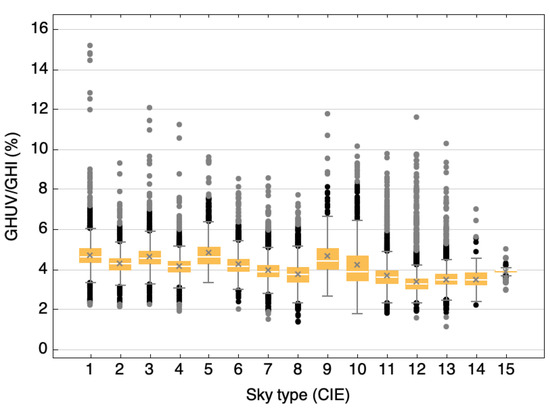 As explained in Section 3.1, during the experimental campaign, sky conditions were determined in Burgos using the CIE standard sky classification, or alternatively, the criteria. Figure 9 shows the results of the statistical analysis of the average GHUV/GHI ratio, calculated using 10 min intervals, for each CIE standard sky type. The highest ratio values were obtained for sky types 5 (4.85 ± 0.92%) and 1 (4.73 ± 0.76%), which corresponded with the overcast sky conditions.