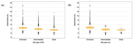 Boxplot of the GHUV/GHI average values for (a) each CIE sky type group and (b) for each sky type classification according to , based on the 10 min datasets.