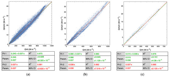 GHUV and GHI (W·m−2) values recorded in Burgos (Spain) from 14 September 2020 to 6 June 2022: (a) 10 min data; (b) hourly average of 10 min data; (c) daily average of 10 min data. Tables below each plot show the two linear regressions (with and without constant), as well as the value and the 95% confidence interval (CI).