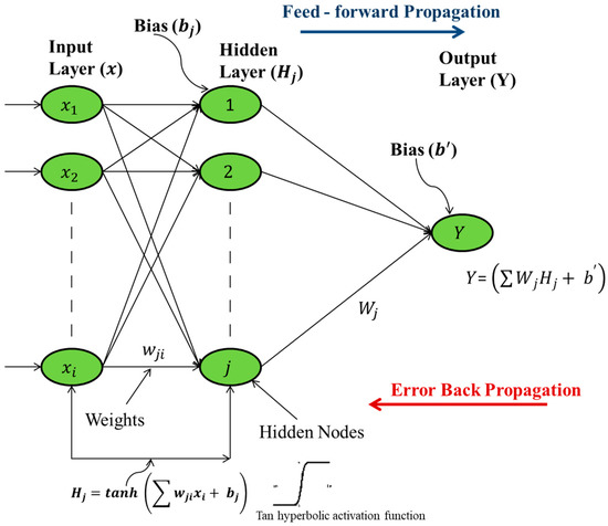 Here, the bias values and correspond to the input-to-hidden and hidden-to-output layers, respectively. During the process of learning, the deviation from the targeted output to the real output is fed back to regulate the weights and bias values of the corresponding layers [36]. The above computation is explained in Figure 1. The developed models are used as objective functions for the optimization work. The entire ANN modelling was done by utilizing the Neural Network toolbox in MATLAB®.