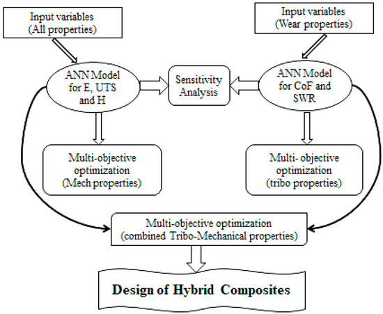 Five various ANN models were created utilizing the dataset as shown in Table 1, comprising the self-determining input variables for the mechanical and wear properties. The impacts of the input parameters seized by the created ANN models were studied by sensitivity analysis. Both the tribological and mechanical properties were optimized separately in a multi-objective manner as there were conflicts among the properties during modelling. To attain the hybrid UHMWPE composites, both the tribo-mechanical properties were then optimized in tandem in a multi-objective manner by keeping the tribo test parameters constant in order to equalize the input variables of both properties. Through all these above-stated optimization studies, the optimal solutions were generated and final compositions for the hybrid UHMWPE composites reinforced with multiple micro/nano particles were decided for manufacturing the designed hybrid composites for further experimentation. The actual computational arrangement narrated in this section is illustrated in Figure 2.