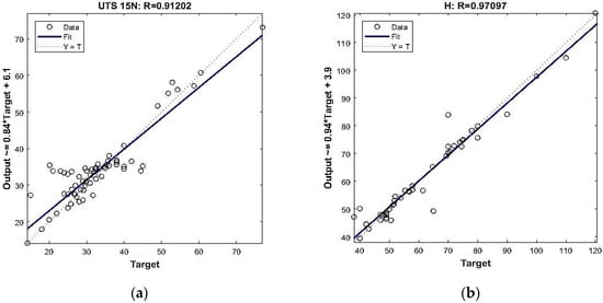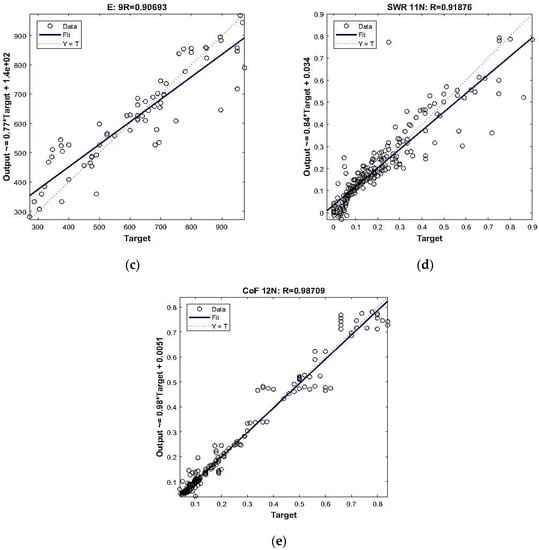Five separate ANN models were created after considering all the input and output variables. After several iterations on varying the hidden neurons in the range between 3 and 15, the feasible models, which had a minimal error with 15, 12, 9, 11, and 12 hidden neurons, were chosen for each of the output variables as three mechanical properties (UTS, H, and E) and two wear properties (SWR and CoF). The predictability of these distinctly trained ANN models are shown with the help of scatter diagrams, as illustrated in Figure 3. The best predictability of the ANN models are evidently seen through the higher correlation coefficients for the corresponding mechanical characteristics of UTS, H, and E, being 0.91202, 0.97097, and 0.90693, respectively. Similarly, the corresponding tribological properties of SWR and CoF were 0.91876 and 0.98709.