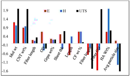 Figure 4 and Figure 5 illustrate the sensitivity analysis plots of the created ANN models. The mechanical and tribological properties bring forth the relationship between all the input variables, comprising the quantity of the four particles in percentage, along with its geometry and its corresponding output parameters, namely, UTS, H, E, SWR, and CoF. The sensitivity plot of the mechanical properties depicted in Figure 3 shows that with the variation in UHMWPE’s molecular weight, there is an encouraging increase in Young’s modulus, with the following exceptions: graphene’s sheet length, the length of CF, and the OD of CF. This leads to a depressing effect. Likewise, there is an encouraging increase in the ultimate tensile strength, with the following exceptions: MWCNT’s fiber length, the length of CF, and the average particle size of HAP. This shows a depressing effect; it also is clearly seen that there is an encouraging outcome on the hardness of most of the variables, with the exception being the MWCNT’s fiber OD, graphene’s sheet thickness, the length of CF, the OD of CF, and the average particle size of HAP, which shows a depressing outcome. It is obvious from Figure 3 that by changing the UHMWPE’s molecular weight, all three mechanical properties tended to show an improvement that can be employed as objective or fitness functions for further optimization studies.