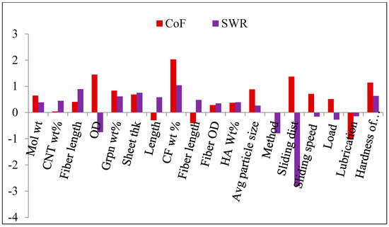 The sensitivity plot of the tribological properties, as depicted in Figure 4, highlights the fact that with the variation in UHMWPE’s molecular weight, there is an encouraging outcome on the coefficient of friction for most of the variables, with the exception being graphene’s sheet length, the length of CF, and the method of lubrication, which results in a negative outcome. It also is clearly seen that there is an encouraging outcome on all the variables of the specific wear rate, comprising the composition and geometry of the particles, with the exception being MWCNT’s fiber OD, wherein most of the variables of the testing parameters of the wear test show a negative outcome, with the exception being the hardness of the contact material. Related results were found by Kanagaraj et al. [46] on the wear test parameters, such as the sliding distance, which raises the wear rate and reduces CoF in the increase of MWCNT, with an increase in the tensile strength and Young’s modulus of the composite. Likewise, the addition of graphene helps to improve the hardness, tensile strength, and wear rate, but decreases the CoF, as also observed by Bahrami et al. [54,55]. Similarly, HAP has a constructive consequence on the wear and biological behavior but decreases the strength. This was also found by Guohan Shi et al. and Macuvele et al. [27,73]. Furthermore, there is a constructive influence on the strength and destructive influence on the CoF due to the addition of CF. The same has been observed by other researchers [74,75].