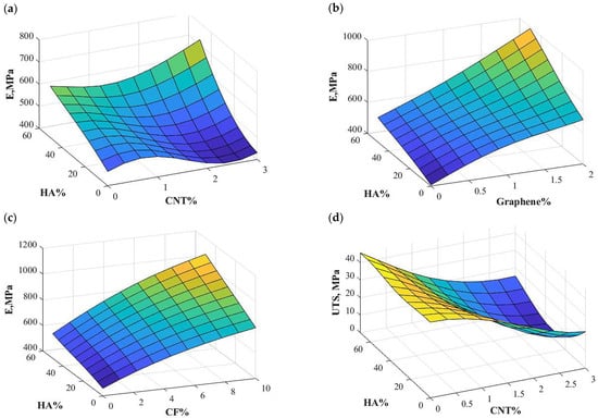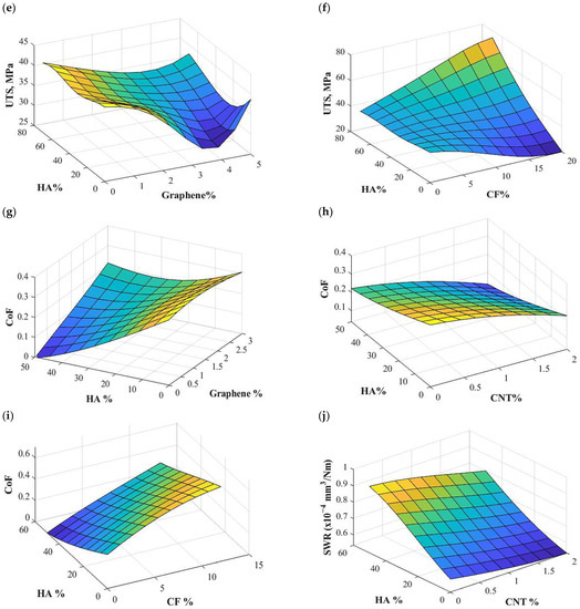 Figure 6 depicts the surface plots of the mechanical properties, namely, E and UTS, along with the tribological properties CoF and SWR, by considering the average value of the corresponding input parameters. The plots were generated by plotting each of the above-said output parameters with the combination of weight percentage of HAP with each of the weight percentages of the other three particles (CNT, graphene, and CF). The below surface plots provide similar observations as the sensitivity analysis, showing the correlation between the input and output variables. Figure 6a–c signify the variation in E due to the effect of the four different reinforcement particles. From these figures, it is evident that to have an increase in Young’s modulus, the amount of HAP required is quite high—about 40 to 50% more in weight—compared to the other particles, such as CNT and graphene, which require a maximum of 2% each. E increases gradually with the addition of CF.