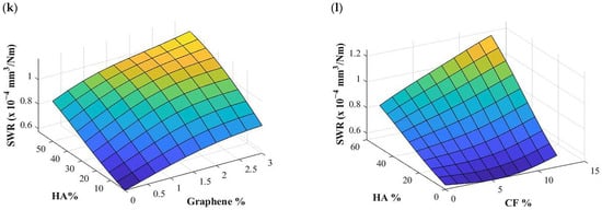Surface plots showing the variation in (a) E with CNT–HA wt%, (b) E with graphene–HA wt%, (c) E with CF–HA%, (d) UTS with CNT–HA wt%, (e) UTS with graphene–HA wt%, (f) UTS with CF–HA%, (g) CoF with graphene–HA wt%, (h) CoF with CNT–HA wt%, (i) CoF with CF–HA%, (j) SWR with CNT–HA wt%, (k) SWR with graphene–HA wt%, and (l) SWR with CF–HA%.