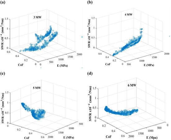 3D Pareto front of E, CoF, and SWR without constraints on varying the molecular weight of UHMWPE (a) 3, (b) 4, (c) 5, and (d) 6.