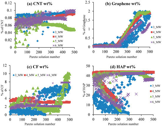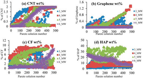 Figure 7 illustrates the 3-dimensional plots of the different Pareto fronts of the combined tribo-mechanical properties CoF, SWR, and E, varying the different molecular weight of the matrix material without having any constraints on the amount of the reinforcement particles to be added. From Figure 7, it is evident that in order to have superior amount of E, the specific wear rate is also improved, which reduces the CoF for all the different values of UHMWPE’s molecular weight. In the actual scenario, the articulating surface must have a lower wear rate and the enhancement of all the required properties is feasible from all these Pareto fronts at their tail region, where the optimal solutions are achievable. The corresponding optimal solutions of the different reinforcement particles without constraints for the grouping of E, COF, and SWR are shown in Figure 8 for the different molecular weights of the matrix material sorted in increasing order of SWR. It is obvious from Figure 8a that the amount of CNT required for enhancement in the value of CoF, SWR, and E is higher at the lower molecular weights and less at the higher molecular weights among the optimal solutions. A similar trend is also observed in the case of CF, which is clearly seen in Figure 8c. The amount of graphene required is predominantly low, as seen in Figure 8b, for all the molecular weights of the matrix, and the role of graphene in the increase in E is insignificant; the same has been described clearly in the Section 3.2 and Section 3.3.