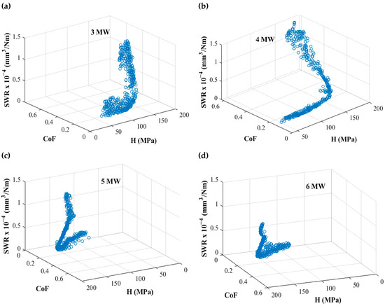 3D Pareto front of H, CoF, and SWR without constraints on varying the molecular weight of UHMWPE (a) 3, (b) 4, (c) 5, and (d) 6.