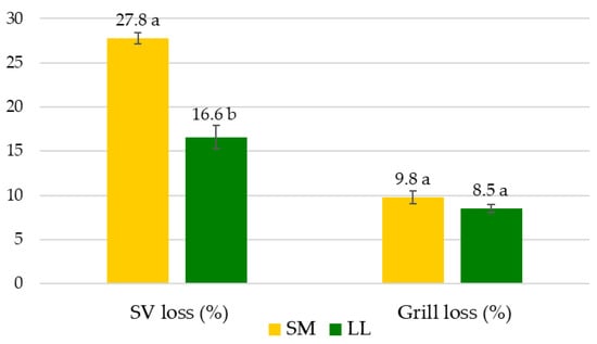 Sous vide (SV) and grilling (Grill) losses (%) in samples of semimembranosus and longissimus lumborum muscles subjected to sous vide and grilling (SVGrill) treatment. Vertical bars indicate standard error of the mean, and a and b represent values with different letters differing at p < 0.001.