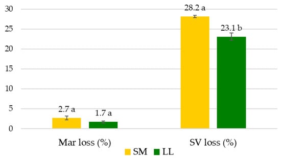 Marinating (Mar) and sous vide (SV) losses (%) in samples of semimembranosus and longissimus lumborum muscles subjected to marinating and sous vide (SVMar) treatment. Vertical bars indicate standard error of the mean, and a and b represent values with different letters differing at p < 0.001.