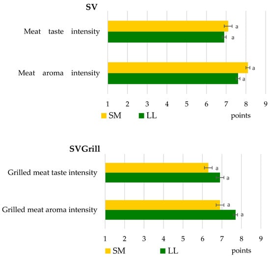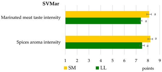 Comparison between specific aroma and taste characteristics of semimembranosus (SM) and longissimus lumborum (LL) muscles subjected to (1) sous vide (SV), (2) sous vide and grilling (SVGrill), and (3) marinating and sous vide (SVMar). Horizontal bars indicate standard error of the mean, and a represents values with the same letter not differing at p < 0.05.