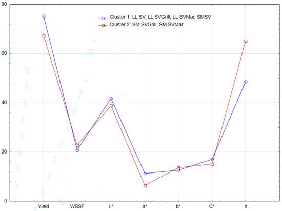 The results of all measurements, excluding the sensory evaluation, were subjected to a cluster analysis to determine the similarities between LL and SM muscles subjected to different treatments (Figure 4). Two clusters were identified. The first cluster contained all LL treatments and SM SV, and the second cluster contained SM SVGrill and SM SVMar.